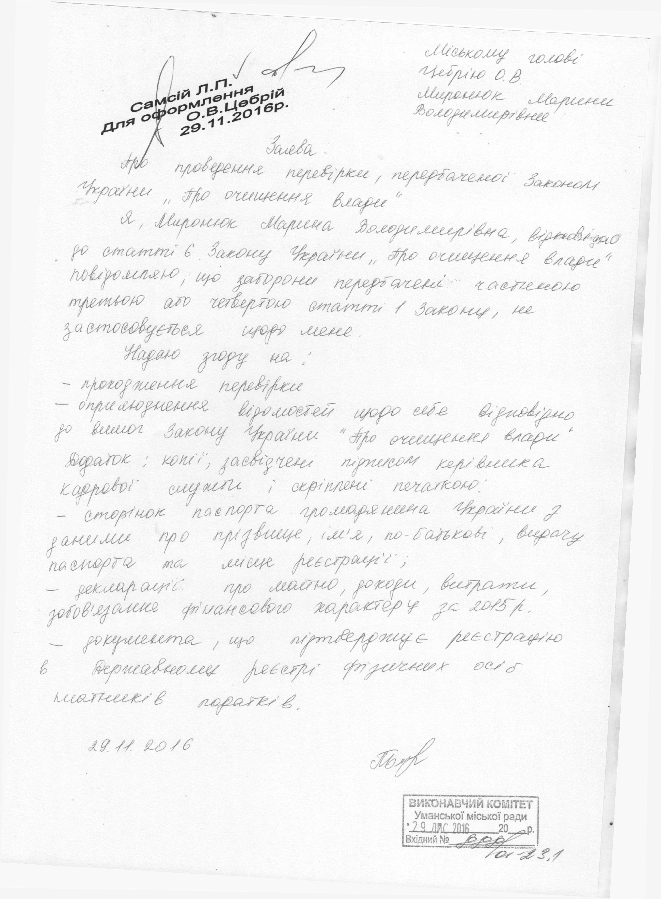 01 грудня 2016 року у виконавчому комітеті Уманської міської ради розпочато проведення перевірки, передбаченої Законом України «Про очищення влади» щодо спеціаліста І категорії відділу аудиту та фінансового контролю Уманської міської ради Миронюк Марини Володимирівни.